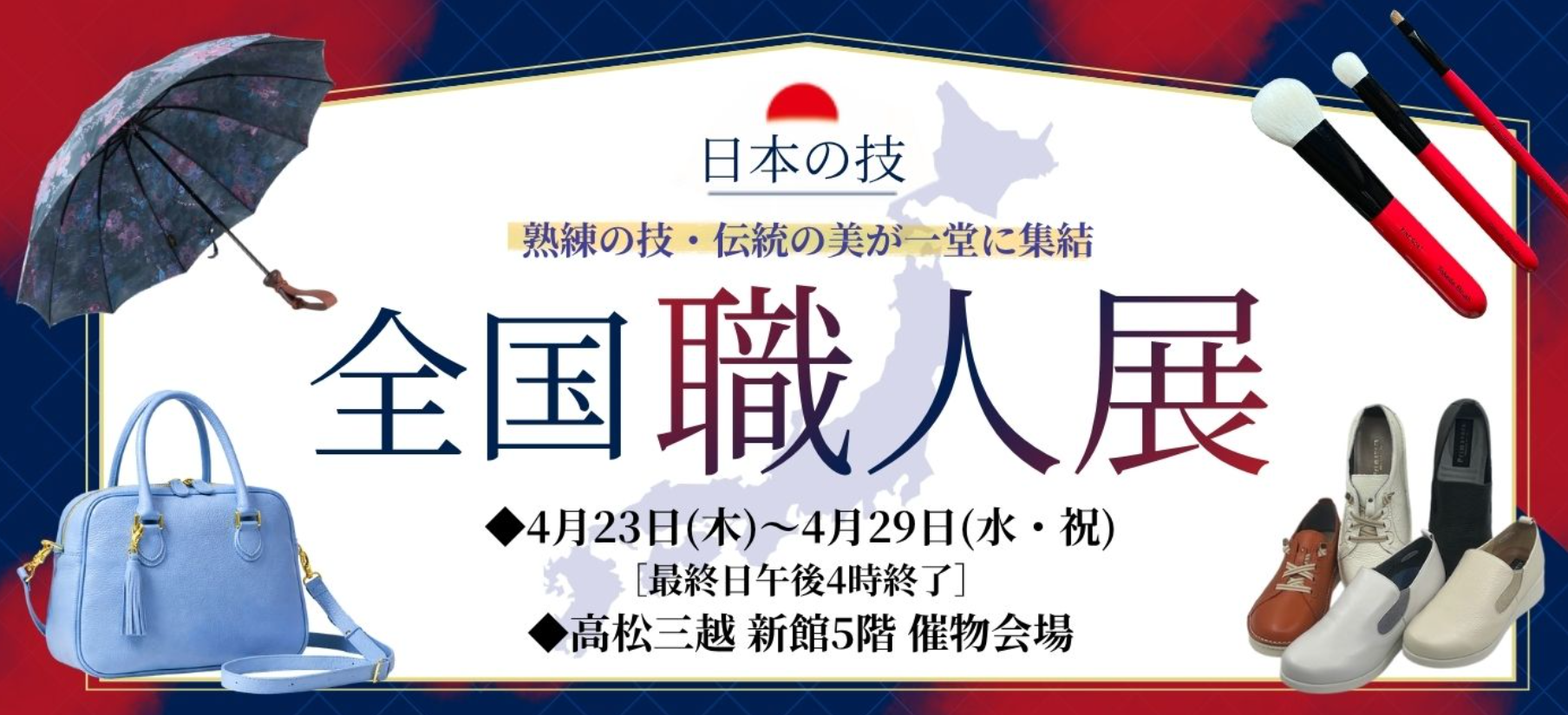 4月23日(木)~4月29日(水) 高松三越 新館5階 催事場「日本の職人 匠の技展」にて出展致します。 船箪笥をはじめ、三国箪笥から新作まで展示致します。 是非、この機会にお立ち寄り下さい。 詳細は、こちら